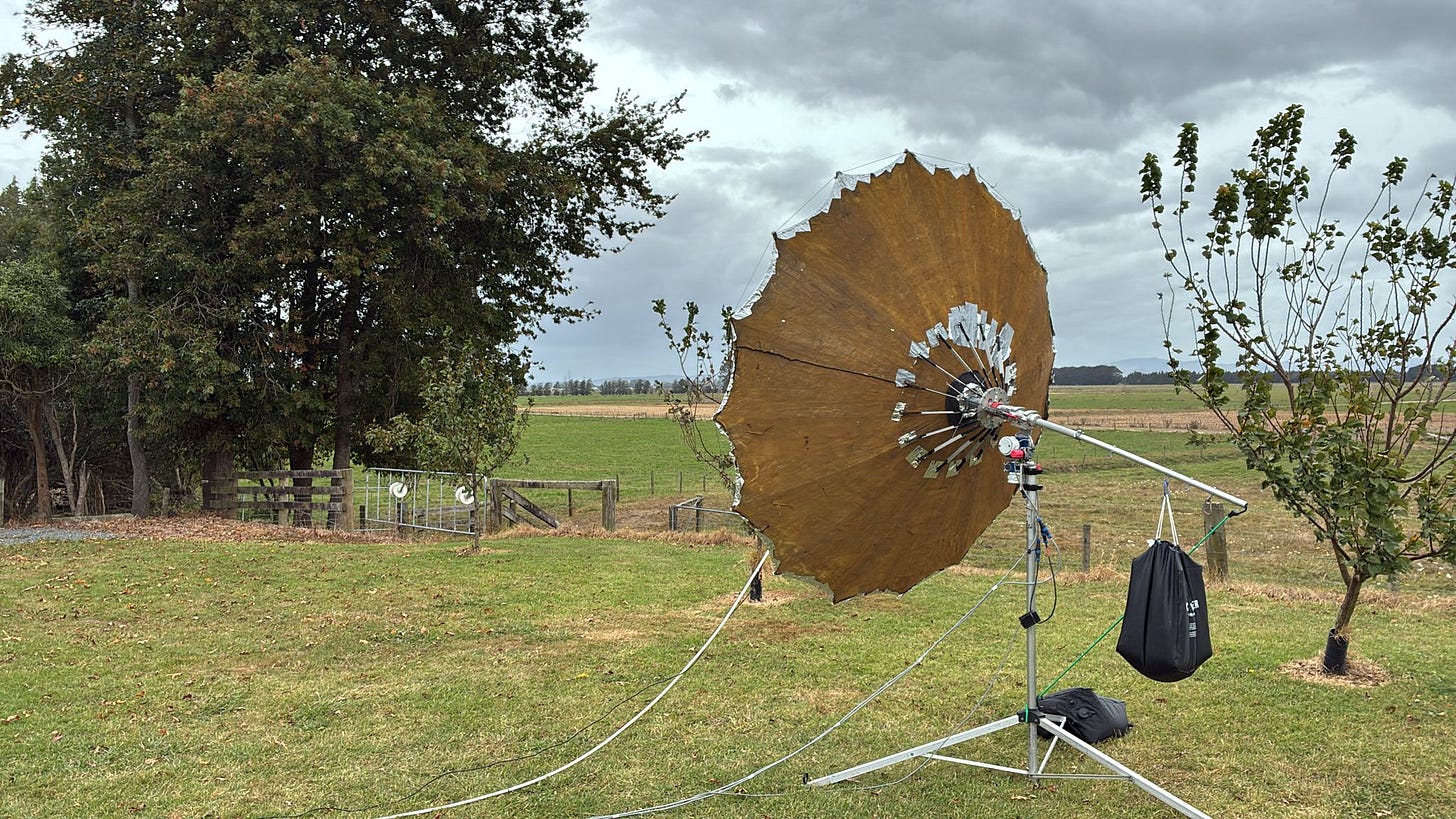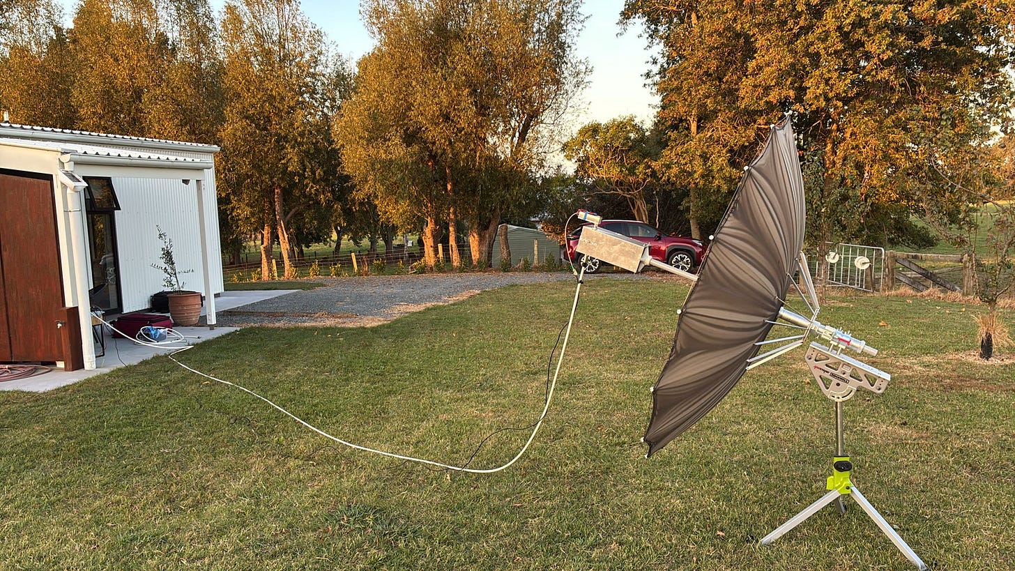 Then I remembered Nathan, ZL1NJR, who was active from the North Island a few years ago. I got in touch, and he kindly let me borrow his 1.8m collapsible mesh dish to give it a shot. However, based on my experience, the silver coating on those mesh antennas degrades very quickly, especially near geothermal or volcanic areas (and we’ve got plenty of those here). There’s a good chance the antenna might be “dead” by now.