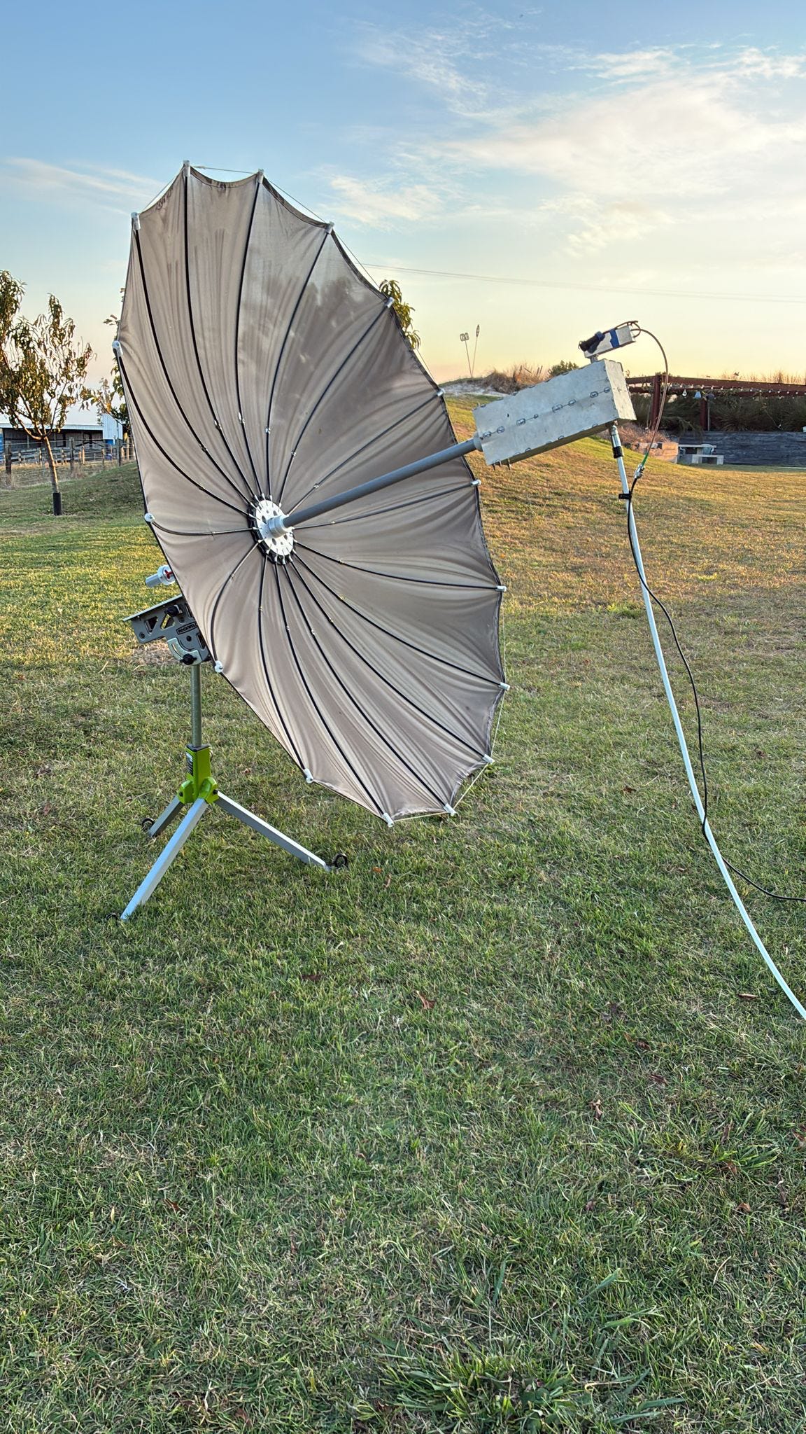 But with few options left, I rented a car and dashed to Nathan’s place and then to a hardware store, racing to get on the air before my MS (Meteor Scatter/Moon Schedule) window. Four hours later, everything was assembled and fired up. I tried to do a Sun noise test, but unfortunately — nothing. It’s possible I’m just missing the focus since the cables aren’t routed through the center and are just fed from the side. Plus, the Sun had already dipped behind the neighbor’s house.